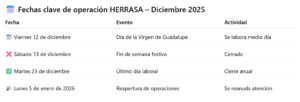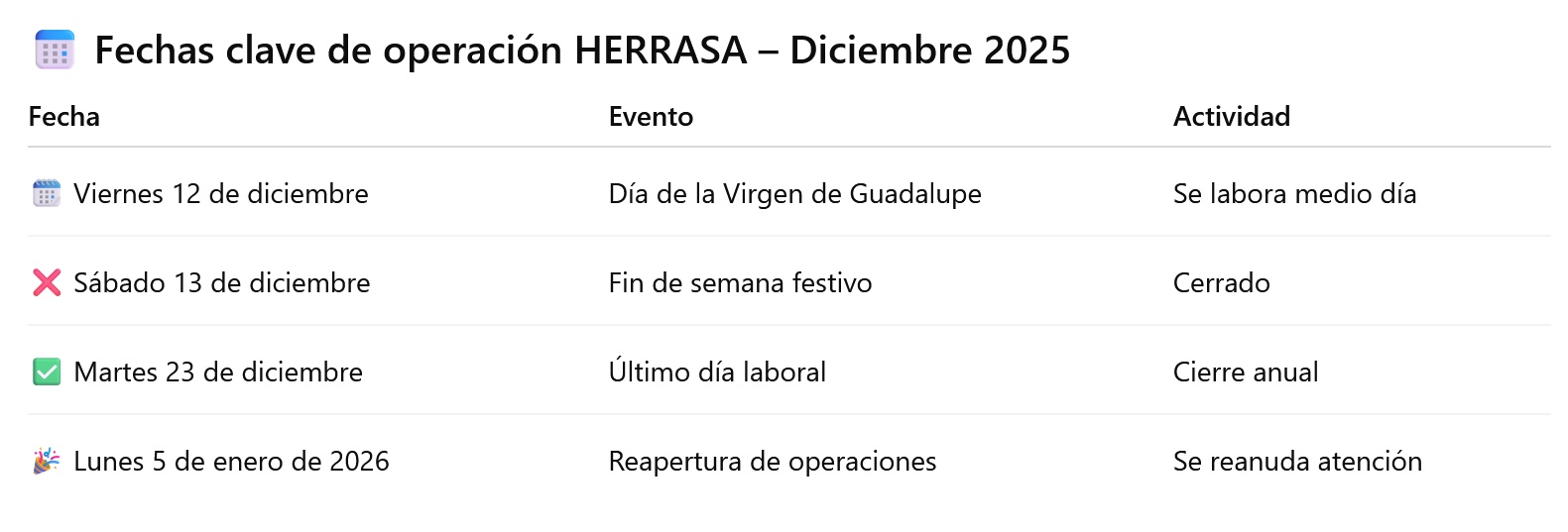 Queremos informarte que HERRASA operará medio día el viernes 12 de diciembre por motivo de la Virgen de Guadalupe y permanecerá cerrado el sábado 13. Nuestro último día laboral será el 23 de diciembre.